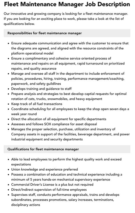 Read Online fleet maintenance manager job description Reader